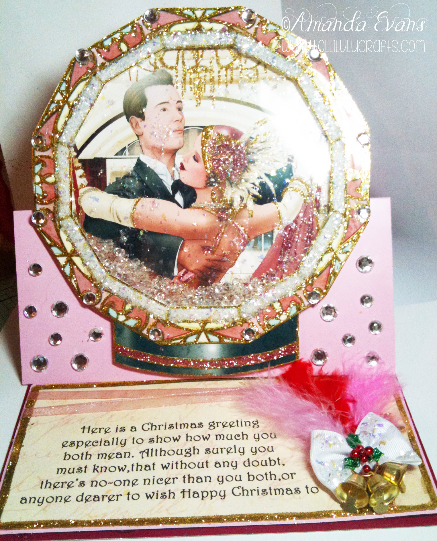 Hiya, So today’s card I made a while back, last Christmas in fact and I dutifully took the photos ready to share with you, at that time, on my Facebook, and promptly forgot! Go figure! lol! Well earlier I was hunting through my photos on my Mac to find the photo to go with this months #TBT and came across these and thought I just have to share it with you. I remember making it and it was so pretty, much more so in life because you really cannot capture the amount of sparkle and glisten there was on this card. I used actual little crystal, the kind you throw all over the tables at weddings for decoration, in the shaker and it just was like fire in there. And the card itself was covered in sparkle and glitter. And of course the final touch for really adding that Christmassy feel was the little bells – these came off the Lindt Chocolate Bunny lol – one of my few recycles. Im not really into that just cos as a rule I think that if someone buys a card from me and there is stuff that you have recycled on it, some people can get funny about it. But in this instance it just was so perfect for the card that I really didn’t think it was an issue. This was a commission card and I knew that the lady wouldn’t mind if she even realised. She gave me the verse to add to the card and basically I was told nothing could be too much on the sparkle sense. Also you can’t really tell from the photos but it was a big card, about 8×8 with an acrylic dome for the shaker part, which looked incredible. You can imagine the lady paid a reasonable amount for it. I am never cheap on my commissions. I know Im such a big head sorry 🙁 But I don’t take very many and they are always for elaborate special cards and I do charge for that. Anyway here it is and hopefully you can get an idea of what it was like because as I said the photos that I take now are better and I think this is a good demo of what difference a year makes 🙂