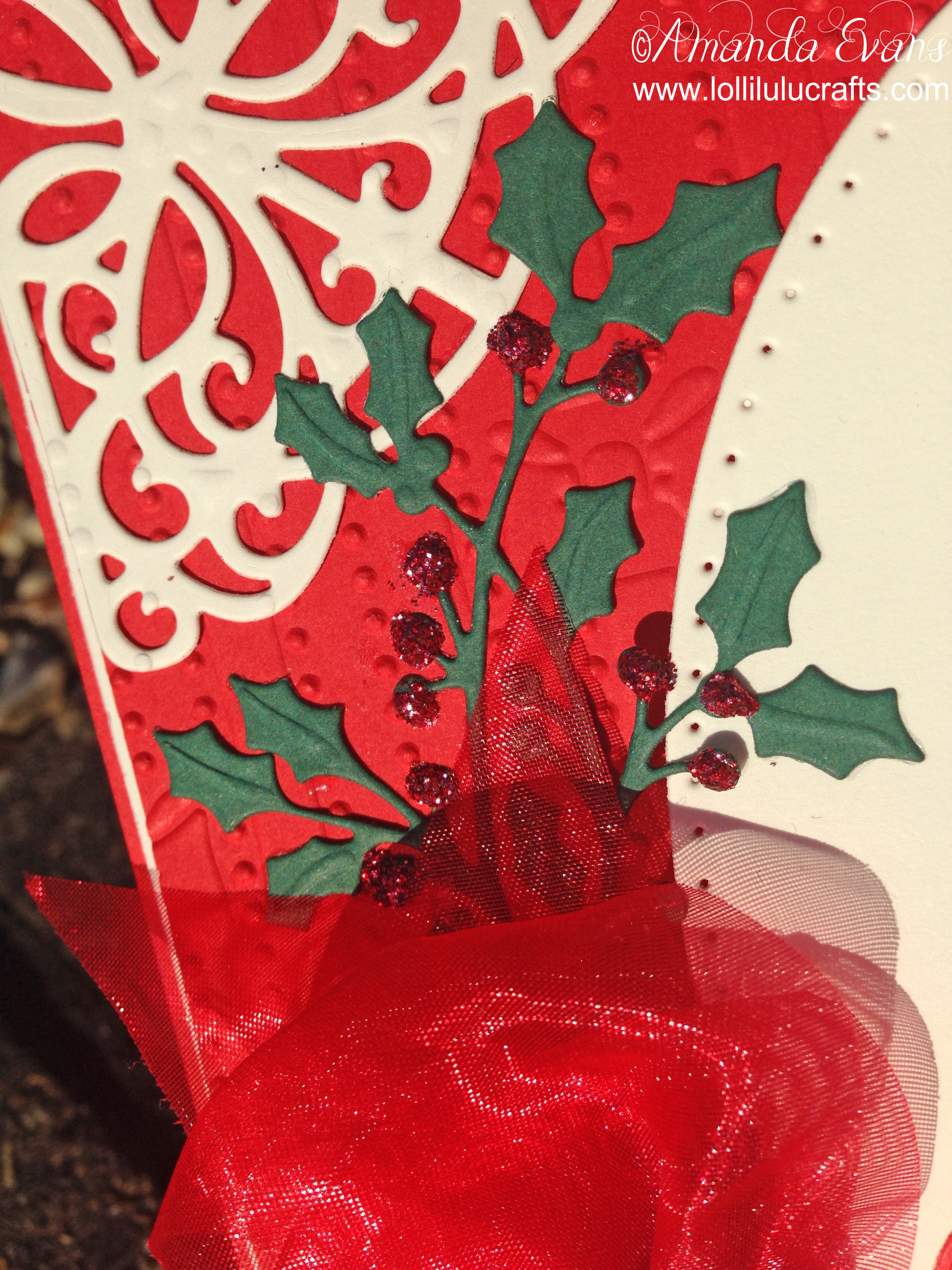 Beautiful card! I really love the holly dies. And the tree die is gorgeous!! OK I love the other ones too. Sure wish I could make a bow like that too…mine are always cock-eyed. The design you came up with is fabulous. Merry Christmas!!