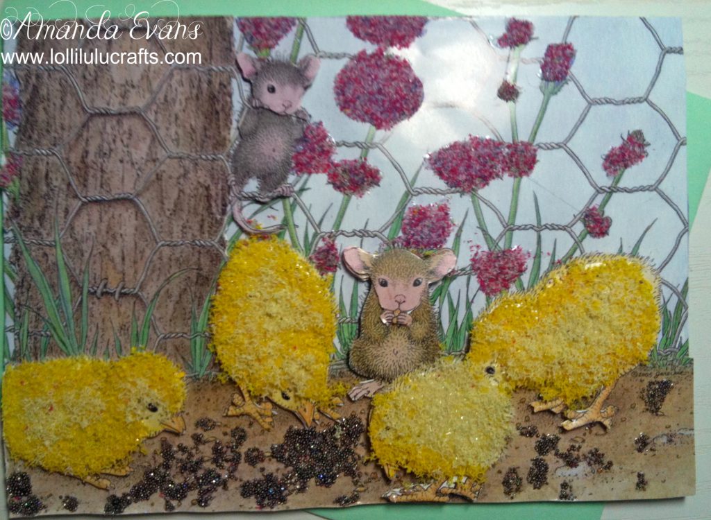 These are cards that I made over the years before I started this blog and I thought it would be fun to share them all with you. You can see that there are a couple of house mouse cards in here but ones made in a couple of different styles. One is made using pre-printed sheets that are cut out to make the decoupage layers and background. Another is stamped and coloured. And another is accented using yellow flowersoft on the chicks.